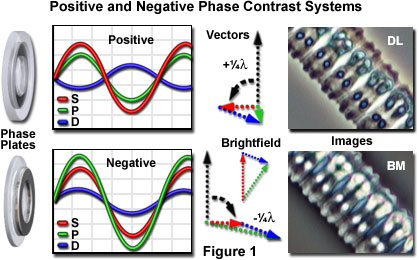 的正相位相反的概述示于圖1中的正相位反差板(圖1的左側(cè))推進(jìn)環(huán)繞波,由1/4波長,由于在玻璃板的侵蝕環(huán),可以減少上部通過在高折射率板采取的波浪物理路徑。?因?yàn)榕c樣品相互作用,當(dāng)所述衍射的試樣射線(D)中都被延遲,由1/4波長,當(dāng)出現(xiàn)從相位板的環(huán)繞和衍射波之間的光程差為半波長。?凈結(jié)果是在環(huán)繞和衍射波,這導(dǎo)致破壞性干擾為高折射率樣品在圖像平面之間的180度的光程差。?為正相位相反的相消干擾波的振幅曲線示于圖1的上圖所得到的顆粒(P)的波的振幅比環(huán)繞(S) -波降低,從而使對象看起來比相對較暗的背景下,作為Zui右側(cè)(標(biāo)DL)所示的Zygnema綠藻的形象。?矢量表示由1/4波長,這被示為在正相位對比90度逆時(shí)針旋轉(zhuǎn)環(huán)繞波的進(jìn)步,出現(xiàn)了圖和圖1中的圖像之間。