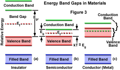 在逐漸升高的能量水平,從細(xì)胞核出發(fā)向外,兩個(gè)不同的能帶可以被定義,這被稱為在價(jià)帶和導(dǎo)帶(圖3)。價(jià)帶中的電子由以比內(nèi)層電子較高的能級(jí),而這些有一定的自由度對(duì)相互作用以形成固體的原子之間的一種類型的局部粘結(jié)的。在靜止更高的能量水平,導(dǎo)帶的電子的行為類似于在單個(gè)原子或分子的電子已被激發(fā)的地面以上的狀態(tài),與自由的高度內(nèi)的固體移動(dòng)。在價(jià)帶和導(dǎo)帶之間的能量差被定義為帶隙的特定材料。