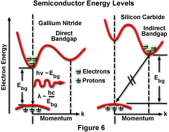 硅和鍺是間接的半導(dǎo)體,其中注入的載流子的輻射復(fù)合是極不可能的例子。的輻射壽命這樣的材料會(huì)發(fā)生在秒的范圍內(nèi),并且?guī)缀跛械淖⑷胼d流子結(jié)合非輻射通過在晶體中的缺陷。直接半導(dǎo)體,諸如氮化鎵或鎵砷化物,具有短的輻射壽命(大約1到100毫微秒),并且材料可具有足夠低的缺陷密度來制造該輻射過程是可能象非輻射性。對(duì)于重組事件發(fā)生在間接帶隙材料中,電子必須有一個(gè)孔在一個(gè)顯著降低重組概率相結(jié)合,造成了能帶 - 能帶間躍遷的發(fā)生之前改變其動(dòng)量。由這兩種類型的半導(dǎo)體材料構(gòu)成的發(fā)光二極管顯示出的量子效率明顯地反映了這一事實(shí)。氮化鎵LED的量子效率高達(dá)12%,而典型的碳化硅LED的0.02%左右。圖6給出的能帶圖的直接帶隙GaN和間接帶隙的SiC示出了兩種類型的材料的能帶 - 能帶的能量躍遷的性質(zhì)。