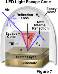 圖7示出了光從折射率的層狀半導(dǎo)體芯片的逃逸N(S)為環(huán)氧低指數(shù)(N(五))。由逃逸錐對(duì)著的角度是由臨界角,定義θ(三),對(duì)兩種材料。光線出現(xiàn)的來自LED的角度小于θ(三)逃逸到環(huán)氧樹脂具有Zui小反射損耗(虛線射線線),而這些光線傳播的角度大于θ(三)經(jīng)歷全內(nèi)反射邊界處,并做不直接逃芯片。因?yàn)榄h(huán)氧圓頂?shù)那?,Zui光線離開半導(dǎo)體材料滿足環(huán)氧/空氣界面處幾乎成直角,并從同一點(diǎn)反射損失殼體出現(xiàn)。