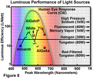 而傳統(tǒng)光源表現(xiàn)出每瓦15至100流明的平均產(chǎn)量,白光LED的效率,預(yù)計(jì)通過持續(xù)的發(fā)展,以達(dá)到每瓦超過300流明。圖8示出了發(fā)光效率值的數(shù)目的LED類型和傳統(tǒng)的光源,并包括CIE為可見光波長范圍(委員會(huì)國際歌DE L'Eclairage)發(fā)光度曲線。這條曲線代表了人眼響應(yīng)的100%效率的發(fā)射極。一些當(dāng)前的LED材料系統(tǒng)的顯示出更高的發(fā)光性能比大多數(shù)的傳統(tǒng)光源,很快發(fā)光二極管預(yù)計(jì)是Zui高效的發(fā)射器可用。