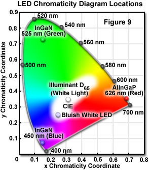 兩個(gè)發(fā)光帶的相對(duì)貢獻(xiàn)可以被修改,以優(yōu)化LED的發(fā)光效率,和總的發(fā)射的顏色特征。這些調(diào)整可以通過改變含熒光劑的環(huán)氧包圍著模具的厚度,或通過改變熒光體懸浮在環(huán)氧樹脂的濃度來實(shí)現(xiàn)。從所述二極管的帶藍(lán)色的白色發(fā)光被合成時(shí),在效果上由加色混合,它的色度 特性是由在CIE色度圖上的中心位置,(0.25,0.25)所表示的(圖9;?帶藍(lán)色的白光LED)。