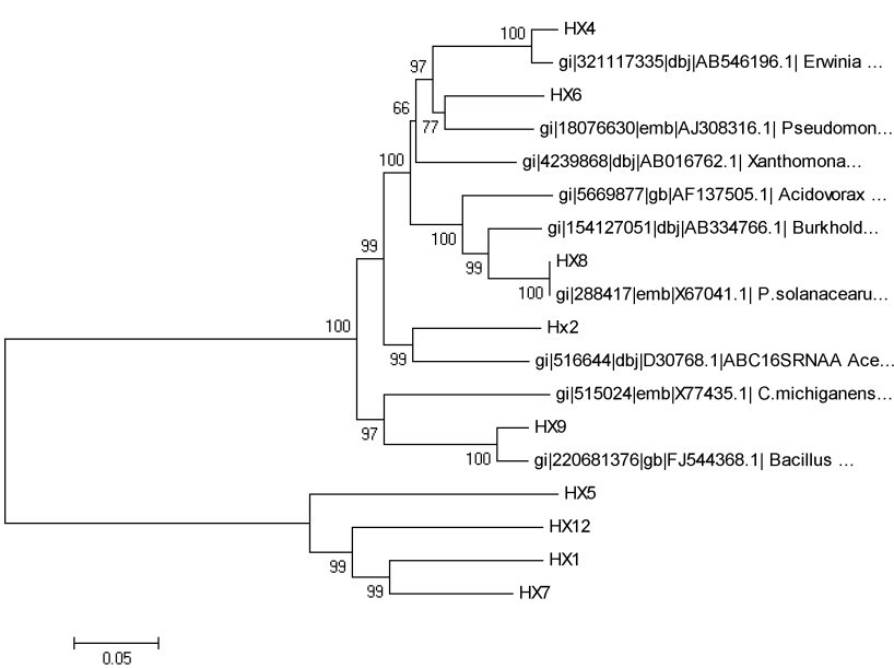 二,附件中小樹節(jié)點(diǎn)處數(shù)值的含義,請各位解釋下為什么HX4和AB546196.1(bootstrap值100)與HX6和AJ308316.1(bootstrap值77)兩類群聚一起后又97呢?是否意味著HX4和AB546196.1親緣關(guān)系很近,甚至是同一個東西,HX6和AJ308316.1關(guān)系較近,這兩類群又聚一起,而且bootstrap值97,大于77,很費(fèi)解呀很費(fèi)解。