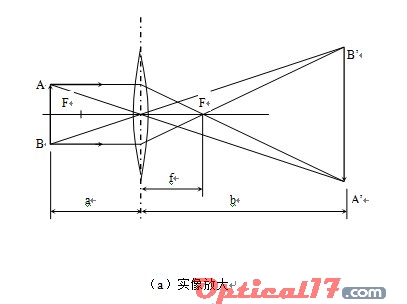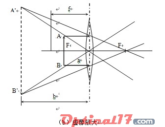 當(dāng)物體AB置于透鏡焦距f以外時(shí),得到倒立的放大實(shí)像A′B′(如圖1-1(a)),它的位置在2 倍焦距以外。若將物體AB放在透鏡焦距內(nèi),就可看到一個(gè)放大正立的虛象A′B′(如圖1-1(b))。映象的長(zhǎng)度與物體長(zhǎng)度之比(A′B′/AB)就是放大鏡的放大倍數(shù)(放大率)。若放大鏡到物體之間的距離a近似等于透鏡的焦距(a≈f),而放大鏡到像間的距離b近似相當(dāng)于人眼明視距離(250mm),則放大鏡的放大倍數(shù)為:N=b/a=250/f