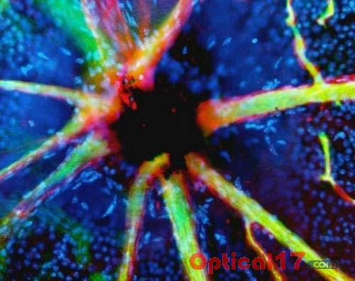 從視神經(jīng)中伸出的血管 這張照片顯示的是血管從黑色視盤中伸出。視盤是個(gè)盲點(diǎn),因?yàn)橐暰W(wǎng)膜的這個(gè)區(qū)域沒有光感細(xì)胞,視神經(jīng)和視網(wǎng)膜血管從眼睛后面的這個(gè)部位伸出去。