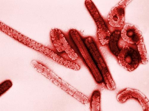 埃博拉病毒的色彩增強(qiáng)的透射電子顯微圖像,一個(gè)類(lèi)似于馬爾堡病毒的RNA絲狀病毒。埃博拉因?yàn)閷?dǎo)致出血熱而被熟知,會(huì)感染人類(lèi)和其它幾個(gè)物種。