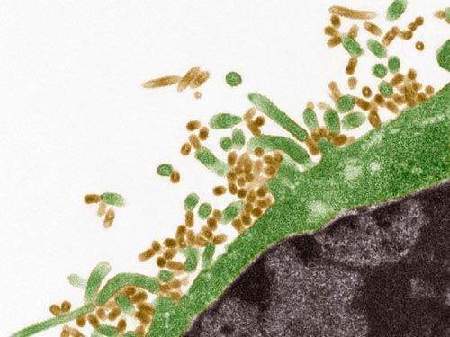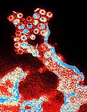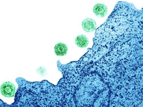 掃描電子顯微圖像顯示人類(lèi)免疫缺陷病毒從一個(gè)培養(yǎng)的淋巴細(xì)胞芽出。細(xì)胞表面的圓形突出為HIV病毒體正在組裝,然后會(huì)芽出。
