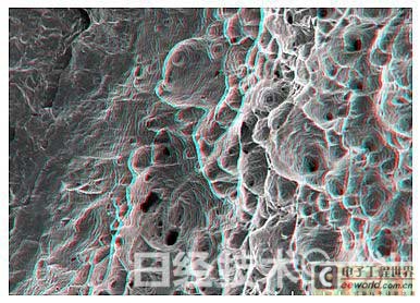 圖3:金屬截面的立體圖像。黑白圖像中難以區(qū)分出凹凸部分,戴上紅藍眼鏡即可看立體畫面。