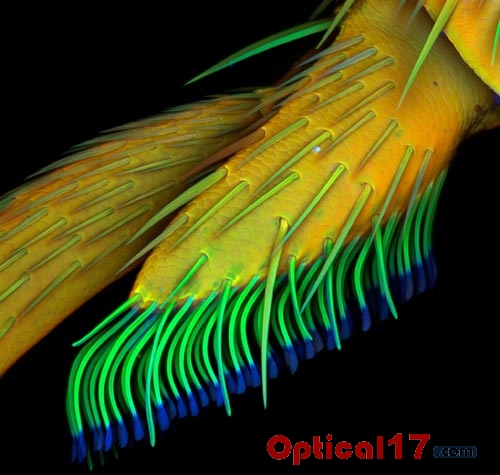德國基爾克里斯蒂安-阿爾布萊希特大學(xué)動物學(xué)研究所的簡-米歇爾斯(Jan Michels)使用熒光顯微技術(shù)拍攝到長角牛甲蟲的腿部.