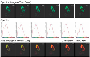 C1si 軟件可以將不同熒光探針的信號清楚地拆分開,包括光譜接近,大范圍重疊的熒光信號(比如CFP, RFP, YFP,和 Alexa488). 在觀察多重?zé)晒馊旧珌矶ㄎ坏鞍追肿樱?FRET 實驗時,這個功能非常有用.通過光譜拆分,還可以清除掉自發(fā)熒光信號。