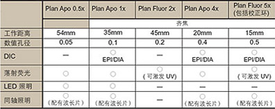 物鏡規(guī)格表
