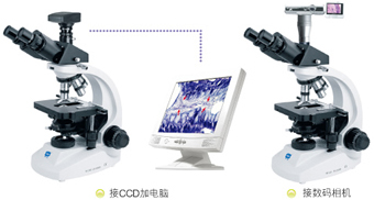 使用三目鏡筒 將CCD通過專用接口連接到投影機(jī)或計(jì)算機(jī)上,配以Snnny Photolib軟件,可以實(shí)現(xiàn)電化教學(xué)或圖象分析處理。 將數(shù)碼相機(jī)安裝在專用接口上,可以實(shí)現(xiàn)照相功能 |